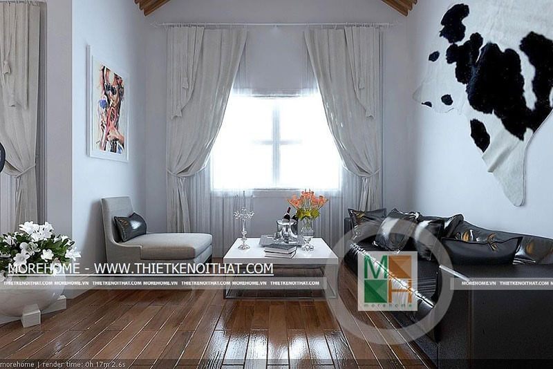 Thiết kế nội thất phòng khách theo phong cách hiện đại với sự kết hợp độc đáo giữa tone màu trắng và đen tạo nên sự ấn tượng và sang trọng.